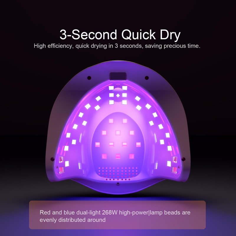 - Dual-Light Technology: This UV LED nail lamp features advanced dual light sources with 42 durable light beads—30 blue light beads and 12 red light beads—ensuring faster gel polish curing and reduced drying time. The lights are evenly distributed on the top and sides of the lamp, allowing you to achieve professional salon-quality nail art easily and conveniently at home.