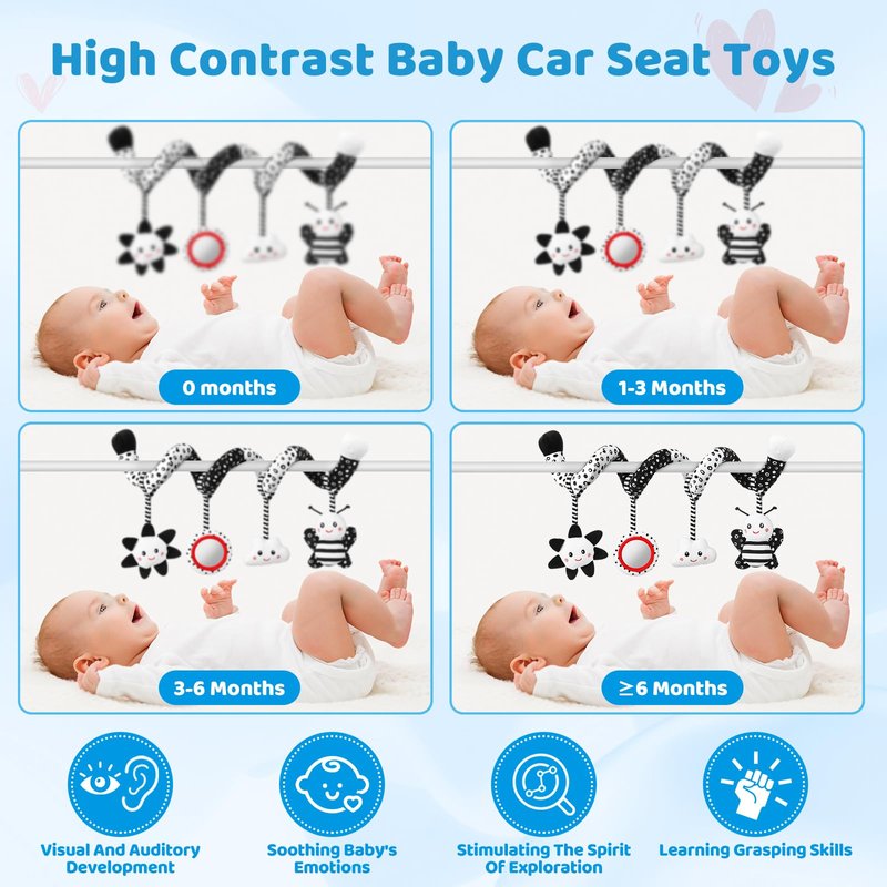 - 【Attractive High Contrast Baby Toys】Our black and white baby car seat toy is specially designed for newborns.It is the great toy for newborn toys 0 3 months brain development.Newborns are born with very blurred vision and can only be sensitive to light. around 0-6 months, they can distinguish high contrast black and white. If you use our black and white baby stroller toy will help to stimulate the development of retina and optic nerve, gradually train and activate your baby's brain development.
