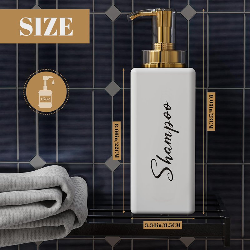 - 【Organize Your Bathroom】With the shampoo, body wash, and conditioner text of bottle body, you’ll never mix up or get asked “ Which soap is which?”. Save desk space with this shampoo and conditioner bottle set.