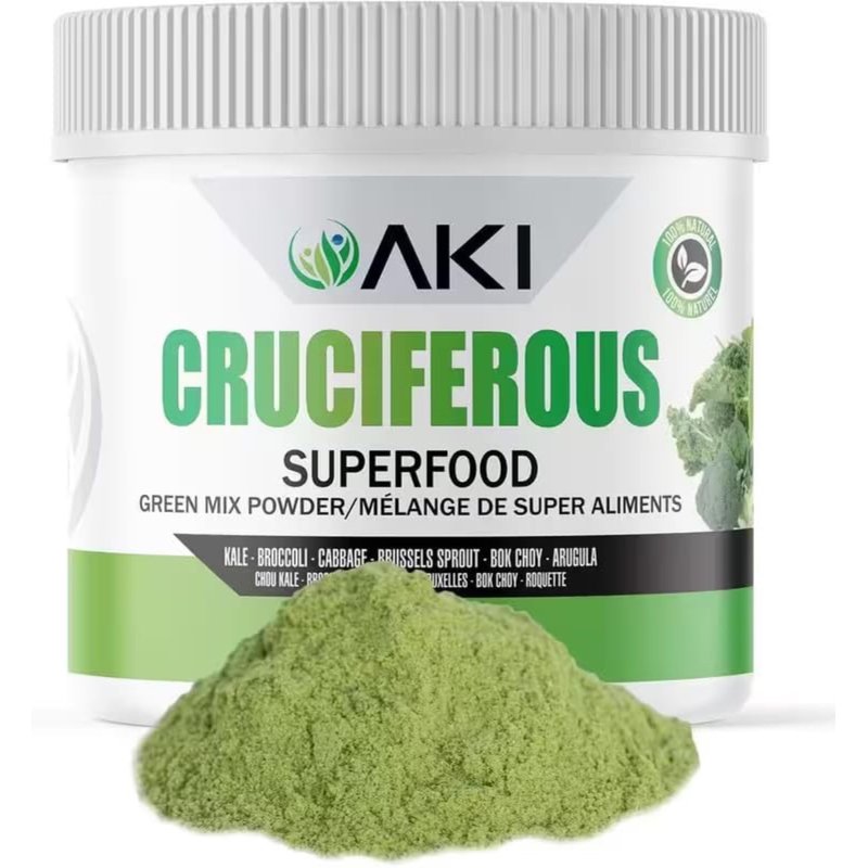 Introducing AKI Cruciferous Superfood Blend, a green mix powder meticulously crafted from a blend of nutrient-rich vegetables including Kale, Broccoli, Brussels Sprouts, Cabbage, Bok Choy, and Arugula. This powerhouse of nutrition is packed with essential phytonutrients, vitamins, and minerals, providing a comprehensive array of nutrients to support overall well-being. The phytonutrients found in cruciferous vegetables have been linked to various wellness benefits, making this blend an ideal choice for those looking to enhance their overall well-being and vitality. We believe in providing clean and wholesome nutrition without compromising on quality. That's why our Cruciferous Superfood Blend is sugar-free and made with Non-GMO ingredients, ensuring that you're getting the authentic form of nutrition with every serving. Incorporating our Cruciferous Superfood Blend into your daily routine is easy and convenient. Simply mix it into your favorite smoothie, juice, or beverage for a quick and nutritious boost. You can also sprinkle it over salads, soups, or other dishes to add a nutritional punch to your meals. With its versatile nature, our green mix powder can be seamlessly integrated into any diet or lifestyle.