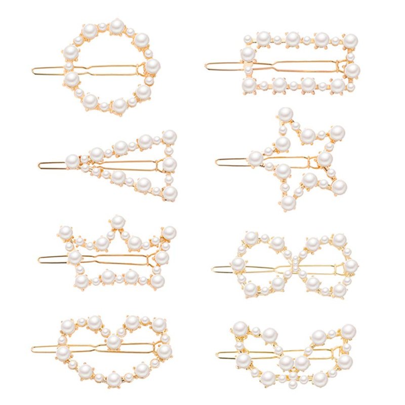 AKOAK 8 Pcs/set Heart-shaped Round Metal Hair Clip Pentagram Geometric Pearl Hair Clip Bangs Clip Ponytail Hair Accessories for Ladies and Girls