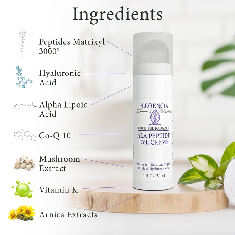 - POWERFUL ANTI-AGING FORMULA: Our ALA peptide eye cream is a potent blend of skin-loving ingredients, including Matrixyl 3000 (Peptides), CoQ 10, Alpha Lipoic Acid, and Hyaluronic Acid. This powerful combination promotes collagen production, moisturizes, minimizes fine lines and wrinkles, boosts skin regeneration, and provides a flourishing glow, making it an essential addition to your skincare routine.