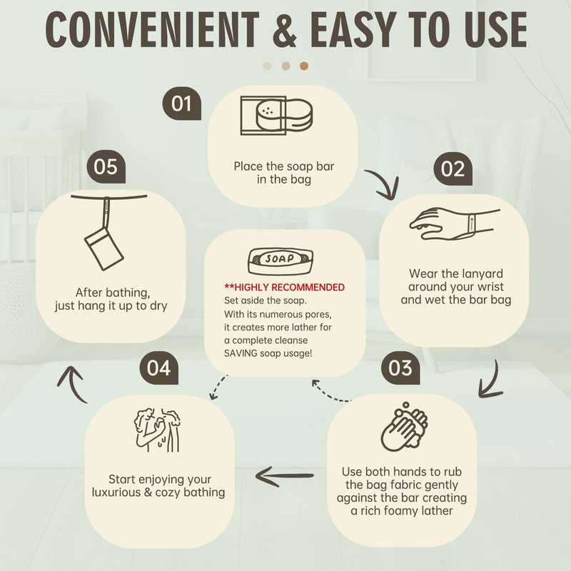 - Portable Bar Soap Pouch: These exfoliating soap bags are convenient and portable, expertly created to be easily hung in your shower area. After enjoying your luxurious and cozy bath, simply hang it up. The breathable construction allows it to dry quickly without any concerns about unpleasant odor.
