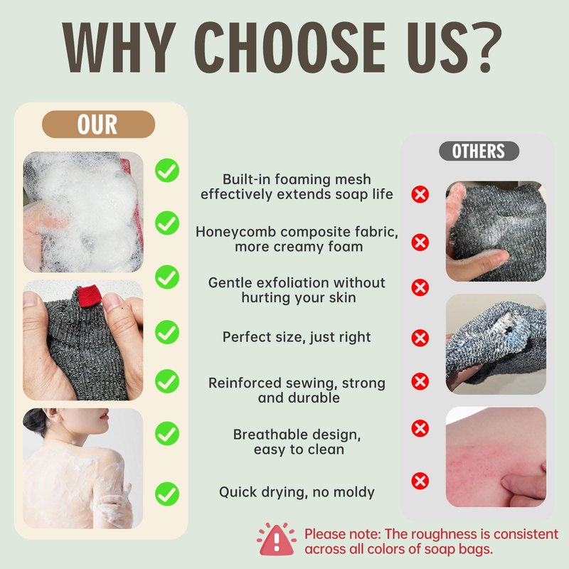 - Gentle Exfoliation: These soap saver bags use compound technology to create a luxurious and creamy foam through its tiny, dense holes, giving you the sensation of being wrapped in soft clouds. The result is an effective exfoliation experience that is gentle on your skin, leaving it feeling smooth and soft. Try it out today to enjoy the ultimate bathing experience!