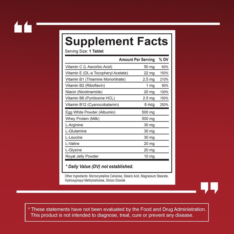 - SUSTAINABLY SOURCED — Our Albumin Complex Tablet Supplement and its ingredients in its naturally powerful 15-in-1 formula are sustainably sourced from trusted suppliers to ensure and provide our customers with products of the highest quality and purity. Our formula's ingredients include: Vitamin C, Vitamin E, Vitamin B Complex (B1 Riboflavin, B6 Pyridoxine HCl, Niacin, B12), Egg White Powder, Whey Protein, Amino Acids (Arginine, Glutamine, Leucine, Valine, Glycine), and Royal Jelly Powder.
