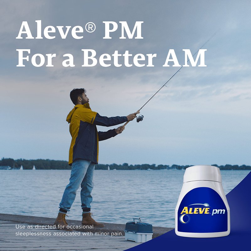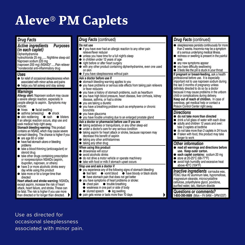 Aleve PM Pain Reliever Nighttime Sleep-Aid Caplets, 20 ea (Pack of 1). Aleve PM is the first over-the-counter PM product with a sleep aid plus the 12-hour strength of Aleve. Aleve is an over-the-counter (OTC), nonsteroidal anti-inflammatory drug (NSAID) that provides temporary relief from minor aches and pains. It also temporarily reduces fever.
