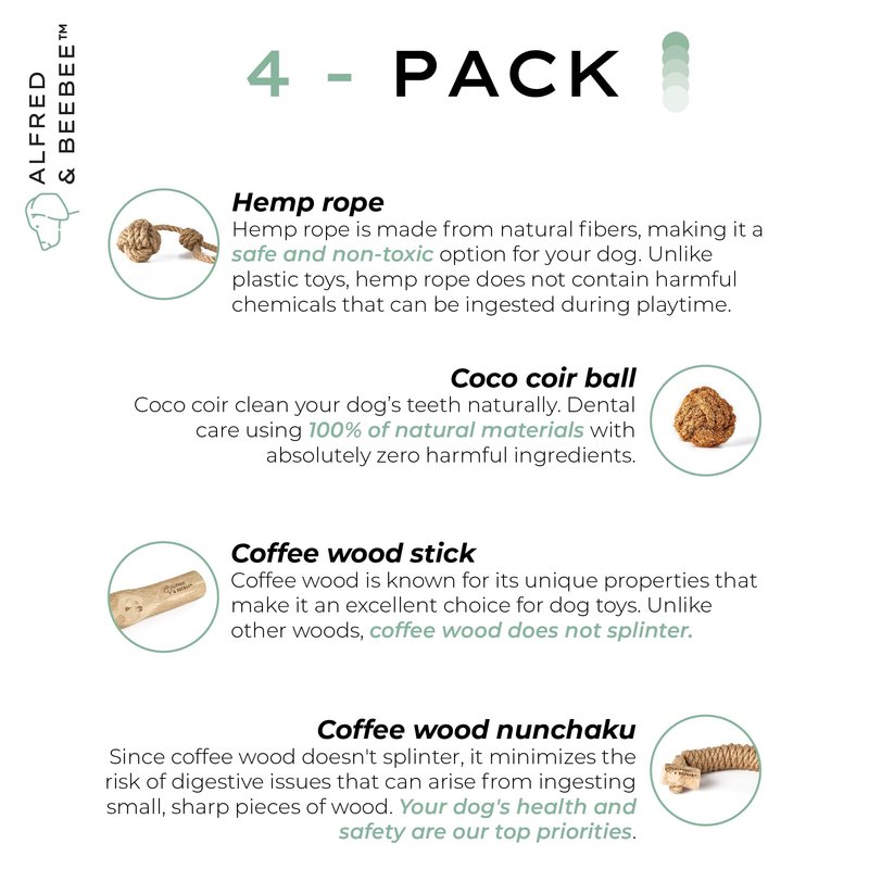 - 4-Pack of Quality Coffee Wood and Hemp Toys: Enjoy the convenience of four natural, wooden toys in one pack, perfect for satisfying even the pickiest dogs. Each toy provides not only entertainment but also promotes dental health and overall well-being.