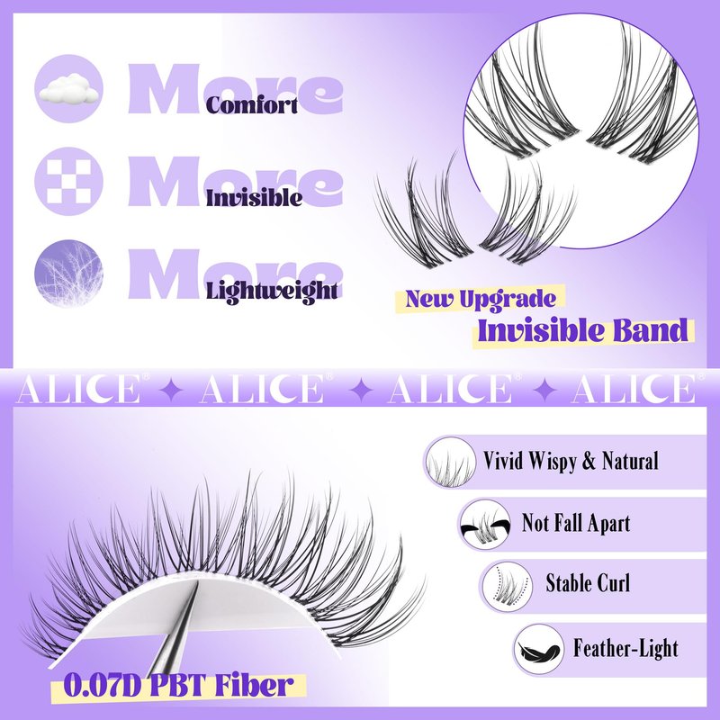 ALICE is committed to providing diverse soft lash clusters for women of all ages and styles.We hope to bring you the most satisfying false lashes and the most enjoyable shopping experience.WHY Choose ALICE:Soft Material & Upgrade Production ProcessReusable & Long-lastingBeginner-friendly & No residueComfortable to apply & No Burden100% VeganChoose ALICE, your Beauty Discoverer & Amplifier!