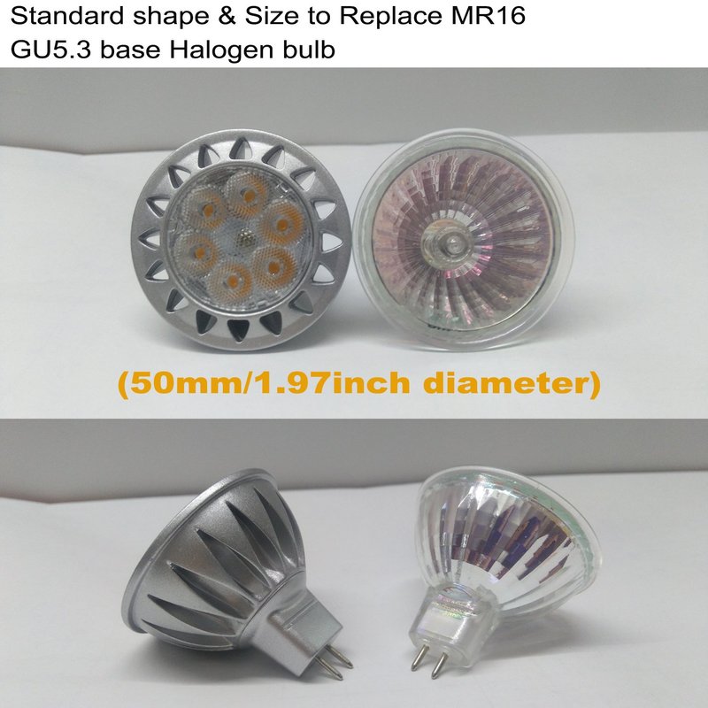 - ✔【Easy Installation】Standard MR16 shape size(Dia50*Height48mm) with bi-pin GU5.3 base. Can be easily fitted replace ordinary MR16 halogen bulbs. ( Please notice! this bulb is used to replace 50MM diameter MR16 halogen bulb, not 35MM diameter MR11 lamp, if you need replace smaller MR11, we also have please search for ASIN B074V5WZ13 )