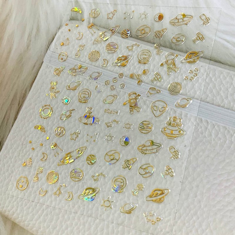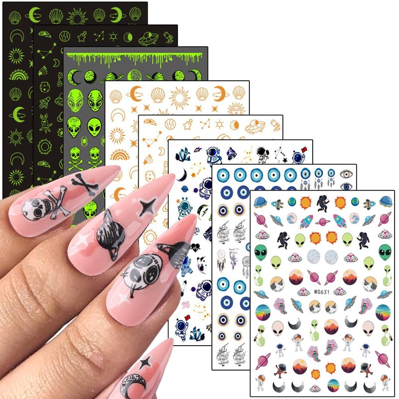 - 【Quantity】You will get 8 sheets extraterrestrial planet nail adhesive stickers, each paper measures 4.1 x 3.1 inches(10.3 x 8 cm). Contains a variety of patterns: mysterious alien, feather, UFO, sun, moon, star, eyes, cosmonaut, rocket, earth, planet, galaxy, etc. These nail stickers are perfect for matching other nail art.