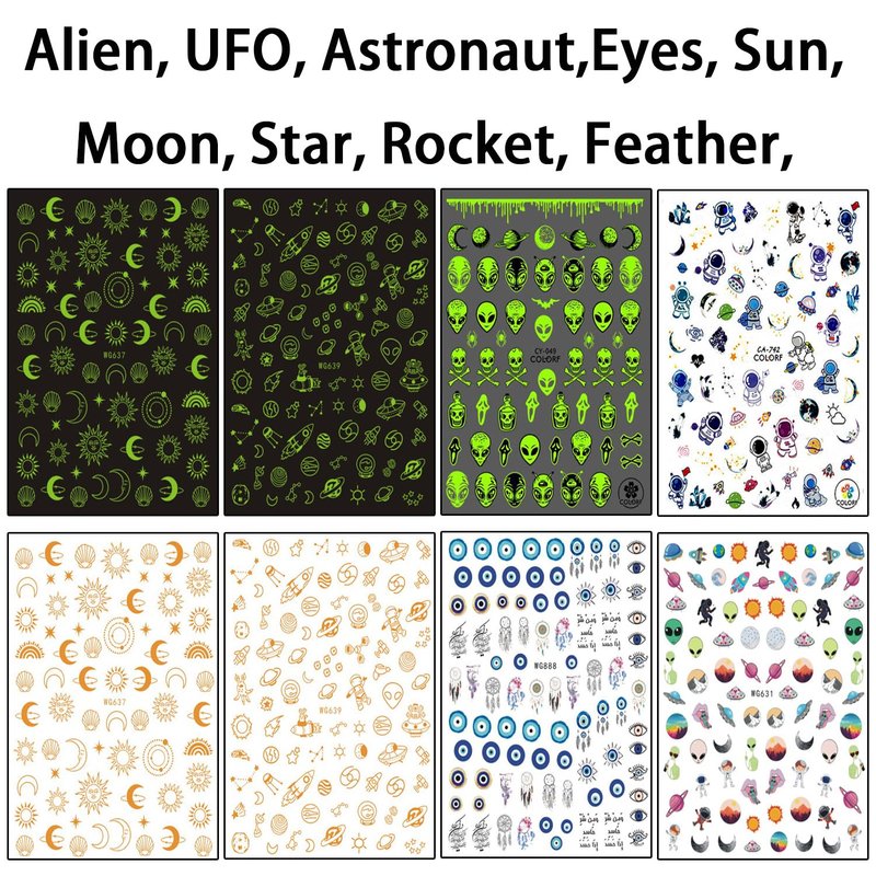 - 【Quantity】You will get 8 sheets extraterrestrial nail art decals, each paper measures 4.1 x 3.1 inches(10.3 x 8 cm). Contains a variety of patterns: Mysterious Alien, Feather, UFO, Sun, Moon, Star, Eyes, Cosmonaut, Rocket, Earth, Etc. These nail stickers are perfect for matching other nail art.