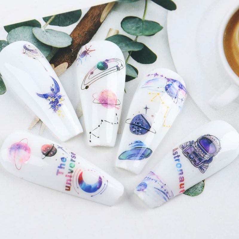 - 【Widely Used】Space nail stickers are suitable for professional nail salons and home use. These fashion alien nail decals nail art decoration is very suitable for 3D nail art, glitter nail art, arts & crafts, holiday decorations, etc. Planet nail art decals are great gifts for nail lover.