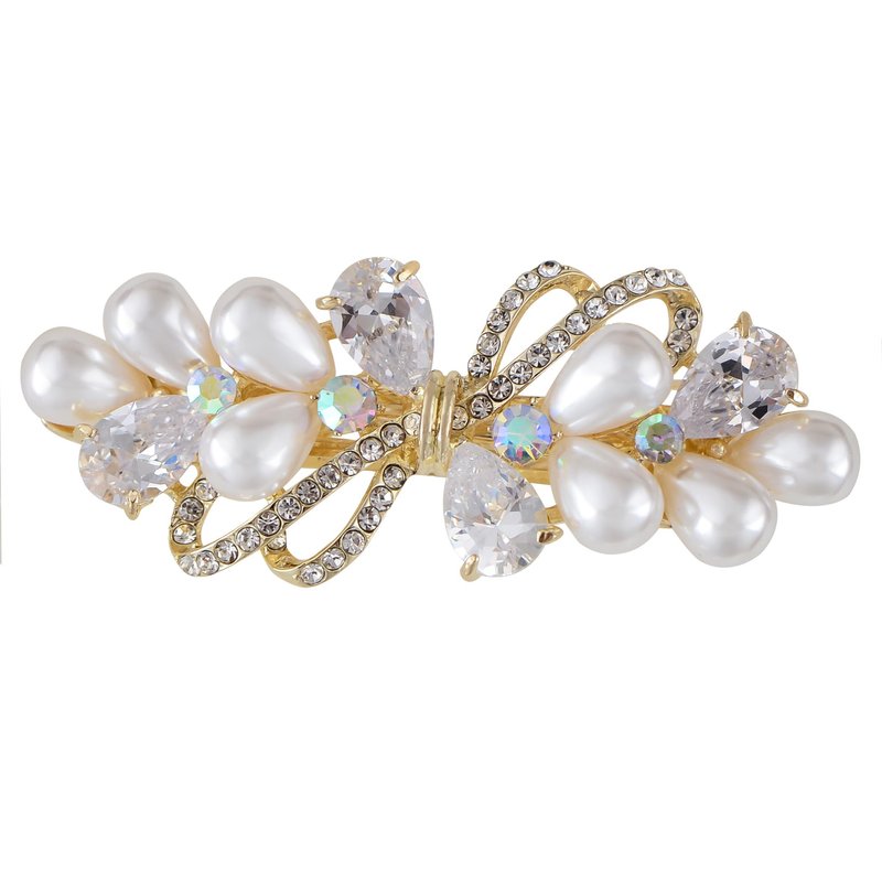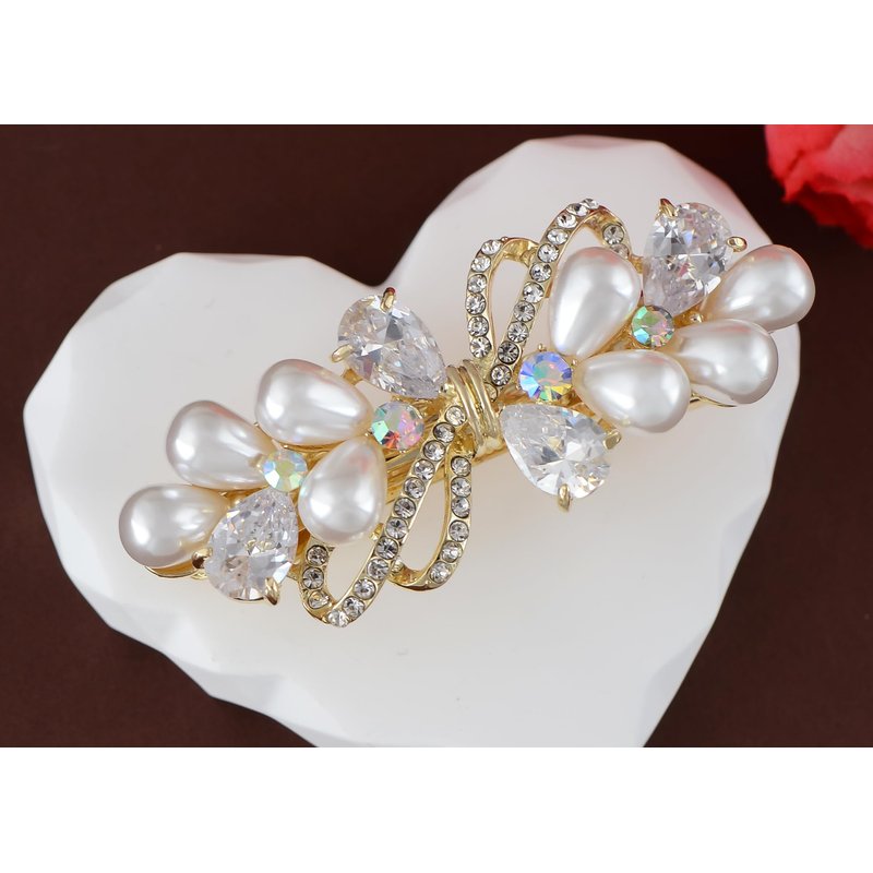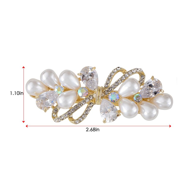 Introducing the Womens Golden Tone Luxury Pearl Crystal Rhinestones Bow Tie Hair Clip, an exquisite and eye-catching accessory designed to elevate your hairstyle on your every day. Made with premium materials and attention to detail, this bow hair clip is adorned with dazzling rhinestones and elegant pearl accents, making it the perfect finishing touch for any look.