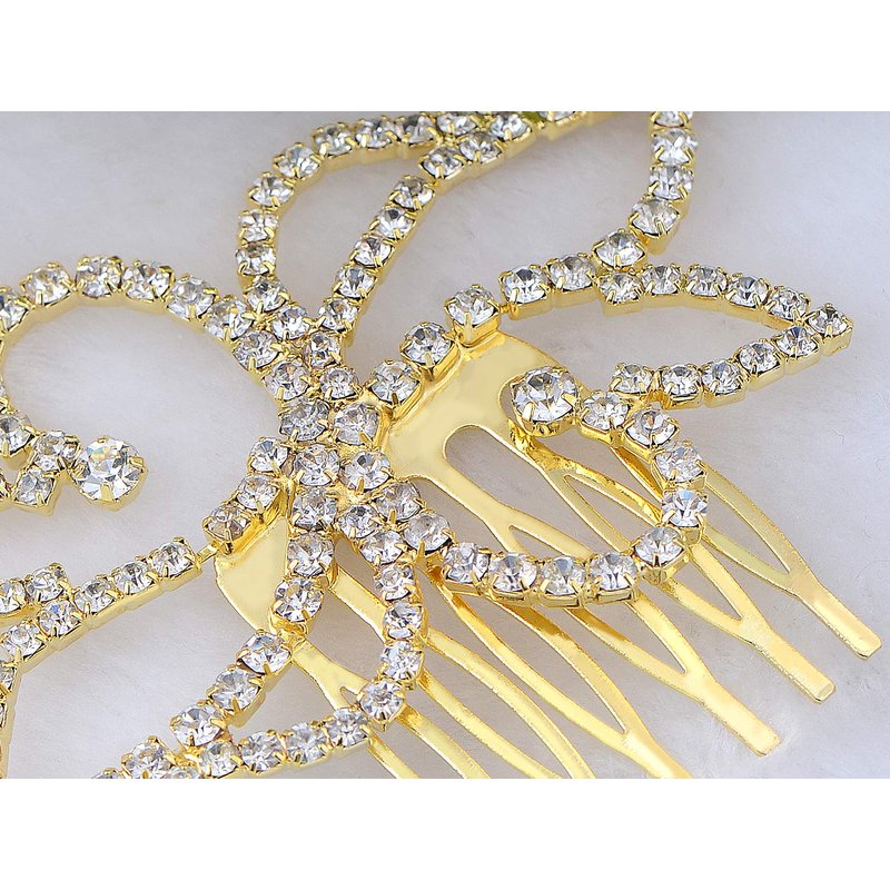 Made from a gold-tone metal alloy, this hair comb features one abstract flower design, complete encrusted with clear crystal rhinestones throughout.