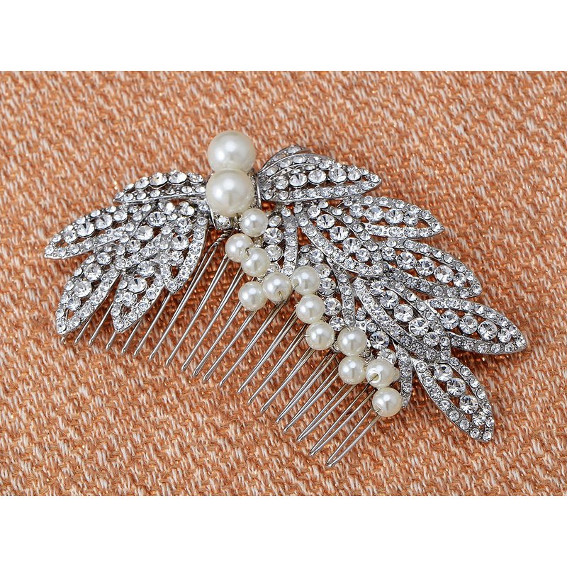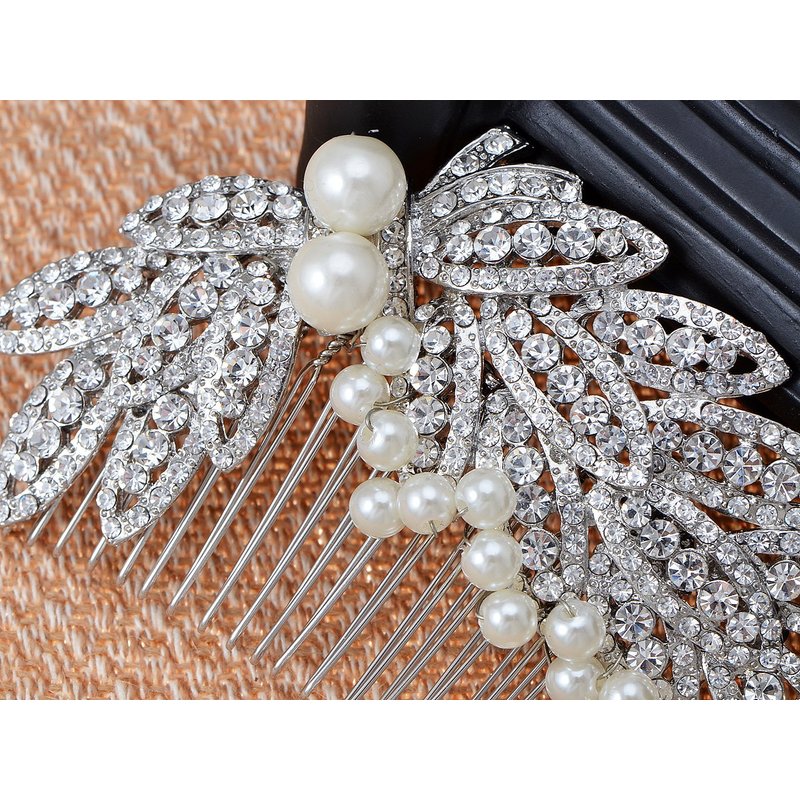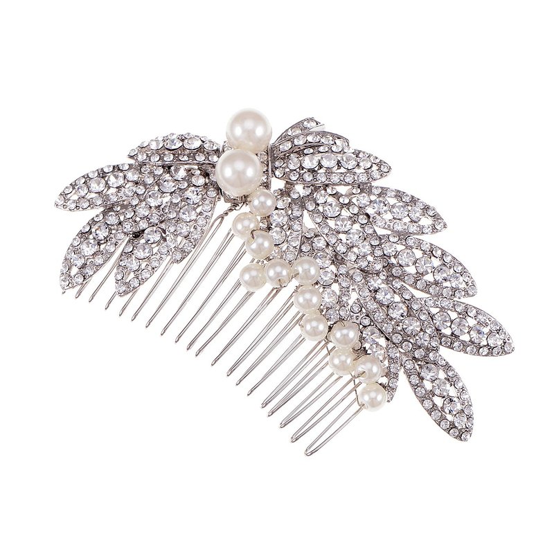- Features: Graceful hair comb featuring faux pearls and a cluster of leaves reminiscent of a holly branch designed with clear crystal rhinestone and silvery tone alloy metal