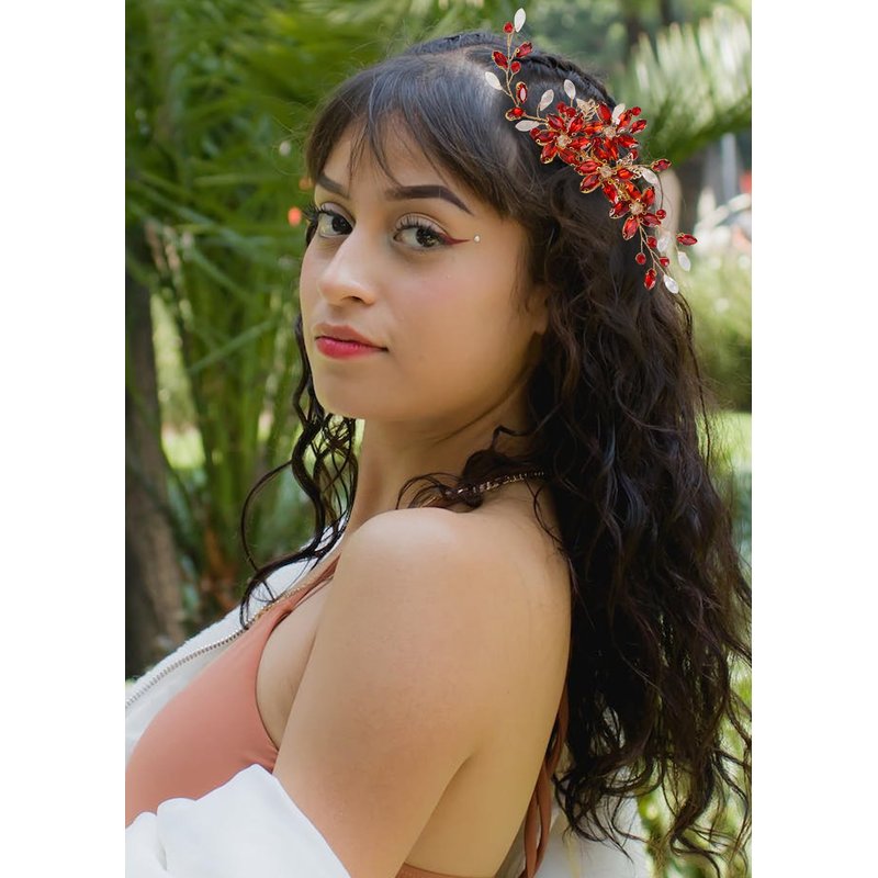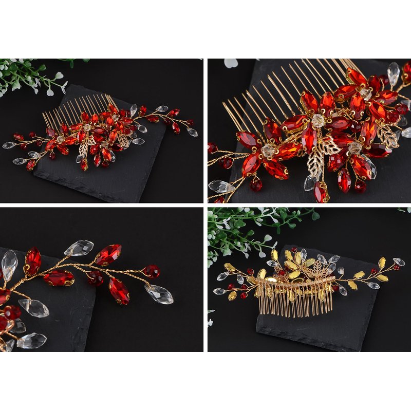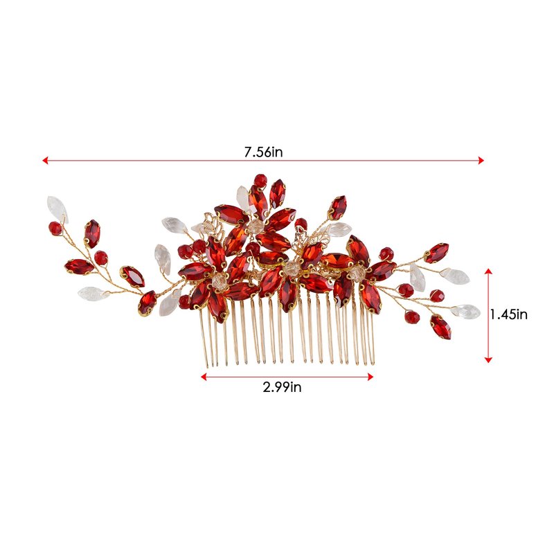 Alilang Red Crystal Rhinestone Bride Wedding Hair Comb Golden Leaf Bridal Hair Accessories