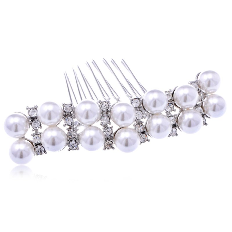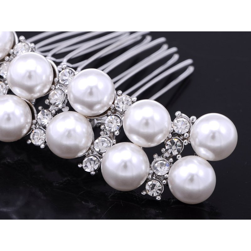 Two rows of faux pearls along with crystal rhinestones create this hair comb. Great for all special occasions, you'll look fabulous with this comb sparkling in your hair.