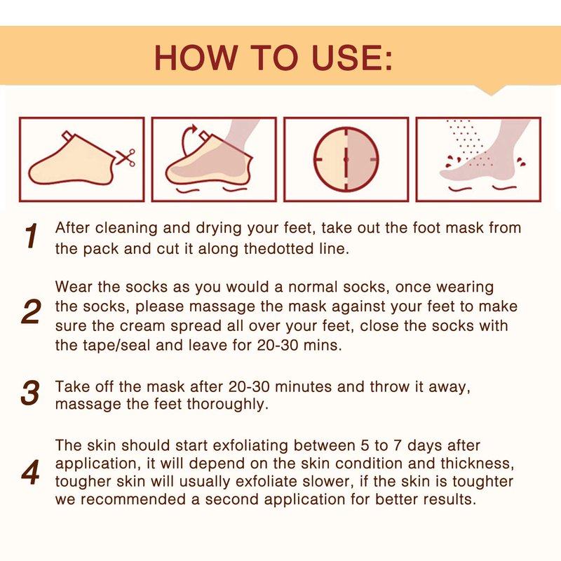 - Baby Soft Skin: Wear foot peel mask on your feet for 50-90 minutes and then remove it. The dead skin on the feet will fall off and the skin so soft like baby foot