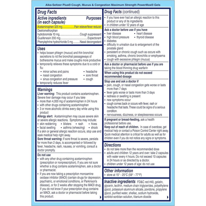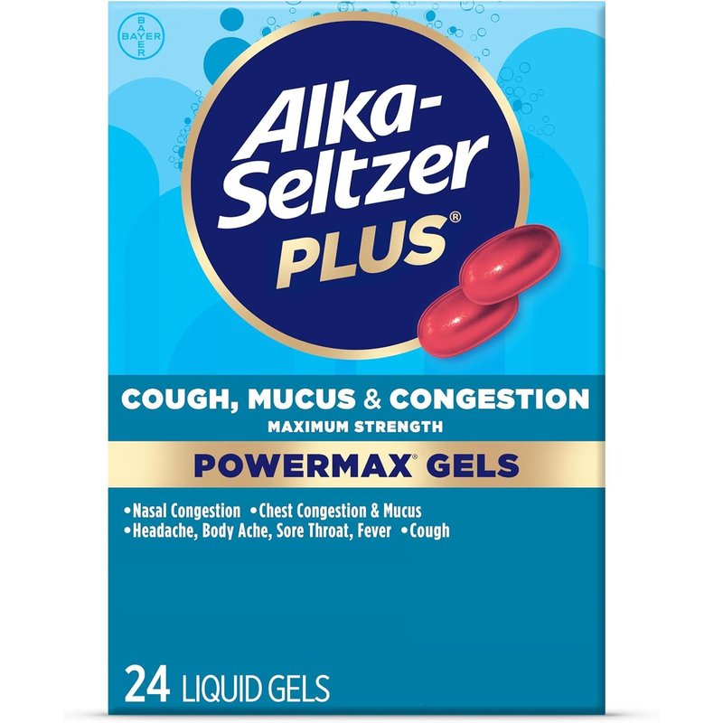 - Alka-Seltzer Plus Maximum Strength Cough, Mucus & Congestion Powermax Liquid Gels provide relief from cough, mucus, and congestion. *Use as directed.