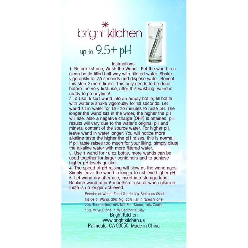 Bright Kitchen Alkaline Water Wand Simply and Easily creates Alkaline Water wherever you are. Simply drop the stick into a bottle of water and it starts its magic - turning regular tap water into Mineral Rick Alkaline water. The same stick works for up to 100 gallons. Stop paying top dollar for bottled Alkaline Water - make your own at home! Never leave home without it...SIMPLE, CONVENIENT & EASY!! Raise pH to 8.5 -9.0 or higher Improve taste of water with beneficial minerals. Made From Food-Grade 304 Stainless Steel