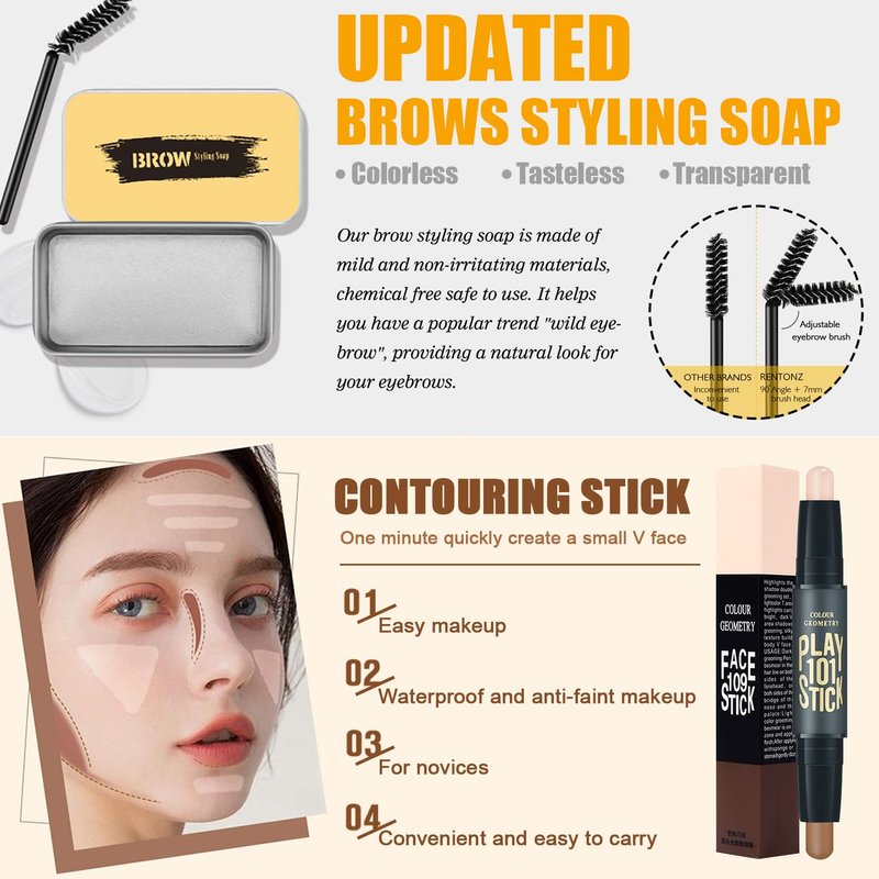Package include:12 Colors Eyeshadow PaletteNude & Beige Liquid Foundation Lipstick x 3Eyebrow Soap Winged Eyeliner Stamp MascaraContour Stick Makeup Brush x 1 Makeup SpongeFace PrimerAbout Clean: Use make-up remover, wiping with paper towels/cotton pads/sponge first. then washing off with facial cleanser.