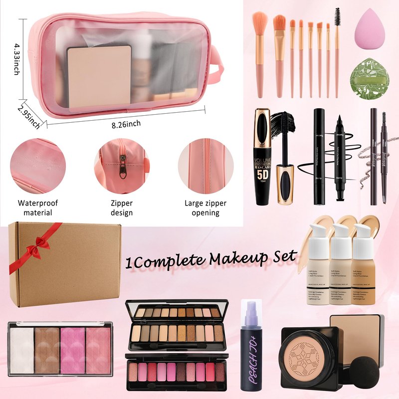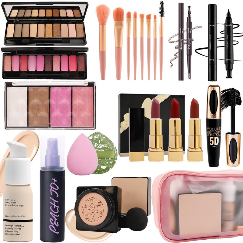 - All in One Makeup Kit - This makeup set contains two bottles of foundation, mushroom air cushion, two eyeshadow palettes, lipstick set, blush touch-up, makeup setting products, eyebrow pencil, stamped eyeliner, 5D mascara, makeup brush set, makeup bag and more. Each product has been carefully selected to ensure that the entire set is coordinated and practical. We also offer three combinations for you to choose from according to each individual's needs.