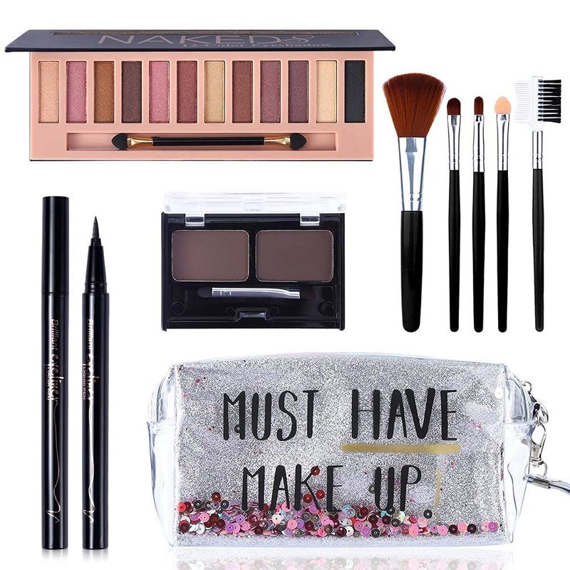 - ❤.Makeup gift set is full of festival vibe features a 12 colors netural eyeshadow palett and black waterproof eyeliner pencil. Plus duo eyebrow powder and a little brushes set. Of course there is cute shimmering makeup bag equipped with all these things you need for daytime or nighttime dazzle.