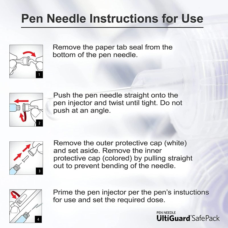 - 100 PEN NEEDLES: UltiGuard Safe Pack contains 100 single-use 31G pen needles with highly polished and silicone coated 5mm (3/16”) needles for a comfortable injection every time