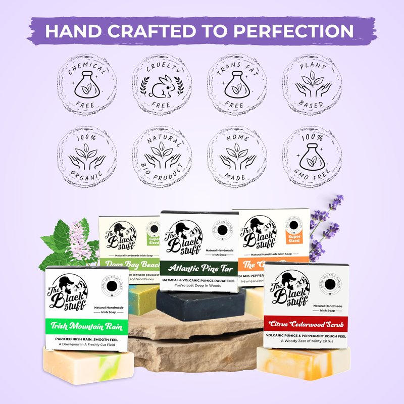 This pack includes five luxurious scents: Pine Tar, known for its deep cleansing properties perfect for washing away tough dirt and grime; Citrus Cedarwood, a refreshing and energizing blend that awakens the senses; Irish Mountain Rain, a crisp, invigorating aroma reminiscent of a fresh morning in the Irish countryside; Good Room, with its sophisticated and masculine fragrance that boosts confidence; and Dogs Bay Beach, a calming scent that transports you to a serene beachside retreat. Each bar soap is not only a perfect soap men will love, but also a thoughtful gift for those who value men's self-care and luxurious skincare.