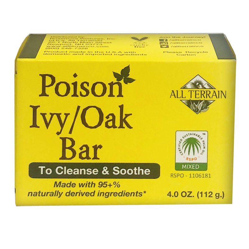 - BAR SOAP: All Terrain's Poison Ivy/Oak bar is a soothing soap to naturally cleanse & calm irritated skin. Formulated with nourishing oils & extracts such as tea tree, soybean, sunflower seed & Rainforest Alliance Certified palm oil.