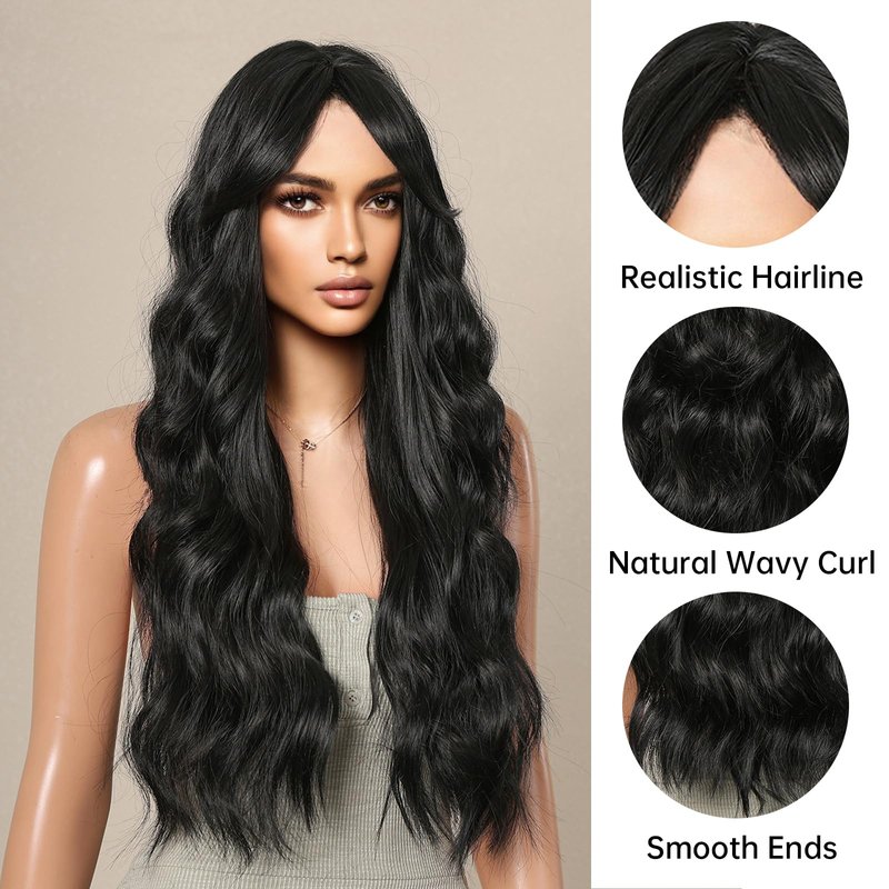 Allbell Long Black Wavy Wigs for Women Synthetic Curly Middle Part Wig with Side Bangs Natural Looking Heat Resistant Fibre for Daily Party Use