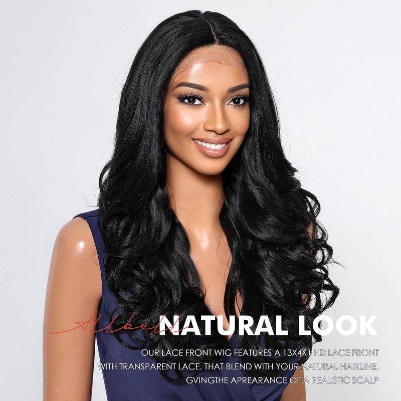 Allbell Long Wavy T Part Lace Front Wigs for Black Women Body Wave Natural Black Hair Middle Part 13x4x1 HD Lace Wig Synthetic Heat Resistant Fiber