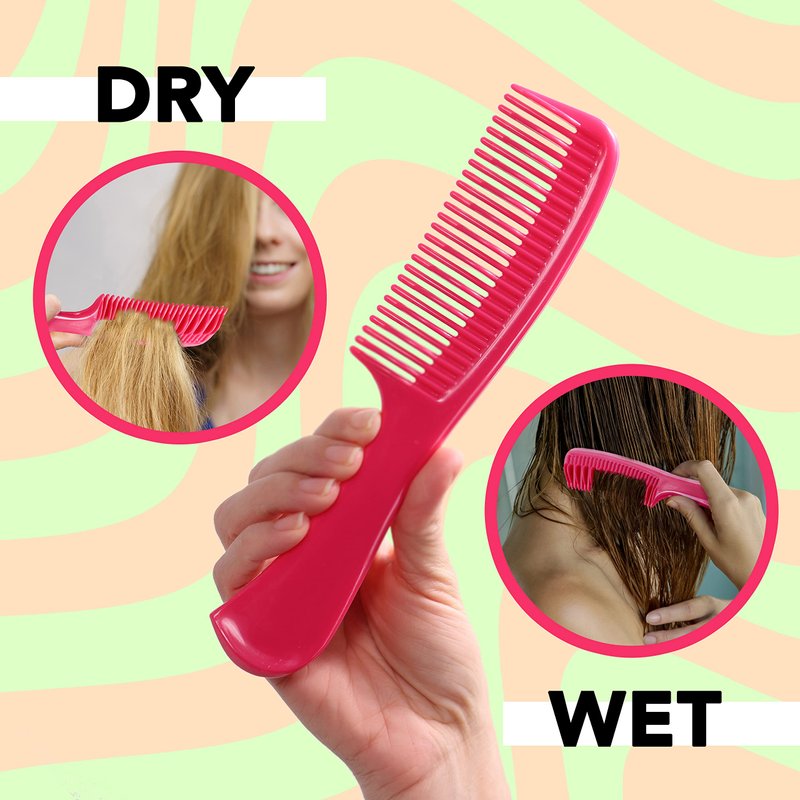 - Ergonomically design for all hand size four inches long handle: easy to grip even when applying hair product, your thick hair and thick comb out with no tangles, thick rounded teeth with tear drop design that will not harm the scalp and can be used multiple times with great results. dimensions: 8.50 x 1.9 x 0.4 in. Wide tooth comb with handle. Big tooth comb.