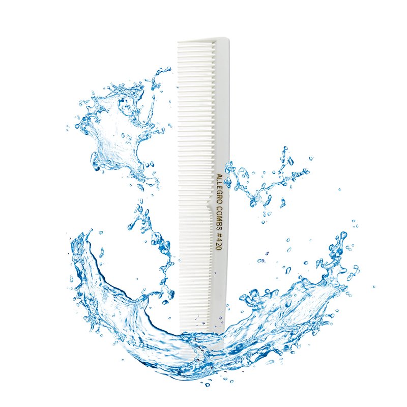 - DISINFECTABLE COMBS WILL NOT ABSORBE AND COLOR WILL NOT FADE IN BARBICIDE - These hair cutting combs model 420 from Allegro Combs will not absorb sterilizing solutions, perms, conditioners, shampoos, oil, water, etc. These combs can be used for wet and dry hair cuts and in many hair styling situations. Colors in comb will NOT fade in disinfectants and other liquids.