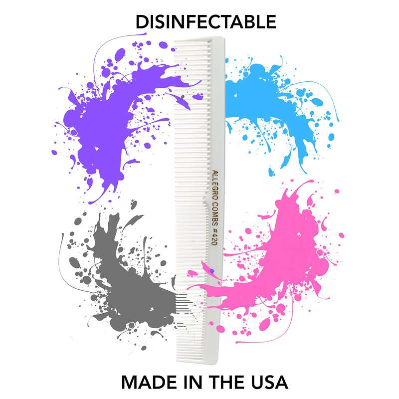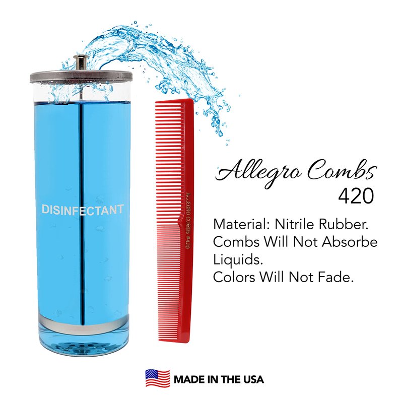 - DISINFECTABLE COMBS WILL NOT ABSORBE AND COLOR WILL NOT FADE IN BARBICIDE - These hair cutting combs model 420 from Allegro Combs will not absorb sterilizing solutions, perms, conditioners, shampoos, oil, water, etc. These combs can be used for wet and dry hair cuts and in many hair styling situations. Colors in comb will NOT fade in disinfectants and other liquids.