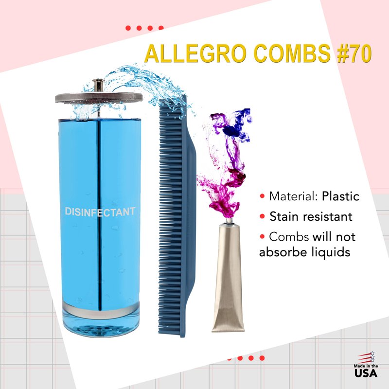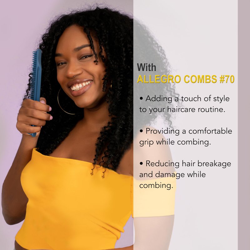 Allegro Combs #70 is a quality, 3-row comb designed to provide the ultimate detangling solution while enabling you to attain a salon-worthy look right at home. Proudly made in the USA. The comb's unique 3-row design makes it perfect for detangling and product application. Its wide-tooth design guarantees manageable, tangle-free hair, and its rounded teeth gently caress your scalp, minimizing hair breakage or damage. Additionally, the convex back design prevents product buildup, making cleaning straightforward. The Allegro Combs #70 is also resistant to staining and fading, retaining its vibrant color over time. Available in trendy, standout colors, this comb injects a dash of style into your haircare regimen. With its 7.80-inches length, it's travel-friendly and easily fits in your purse or bag. It's the perfect haircare gift for those who cherish their hair. More than a detangler, this comb is a versatile styling tool, perfect for parting, braiding, and crafting intricate hairstyles. It's ideal for thick and curly hair types. It's also designed to train your curls, making it a great choice for curly hair, barbershops, and all genders and ages. This hair comb is excellent for braiding, styling, and finishing, making it a versatile tool for all hair types. Its medium tension tooth comb is perfect for wet hair, while its wide tooth comb is ideal for wavy hair. Furthermore, the super wide tooth comb is perfect for fine hair. Its 3-row detangling comb feature facilitates easy hair detangling and styling, while its curling comb feature is perfect for curl training and styling. It's also great for shower use and is kid-friendly, thanks to its gentle touch on their delicate hair and scalp.