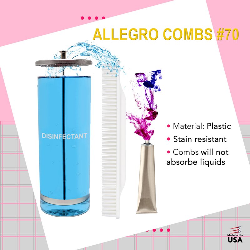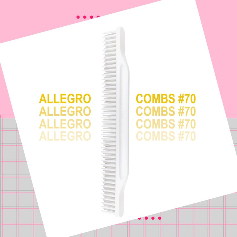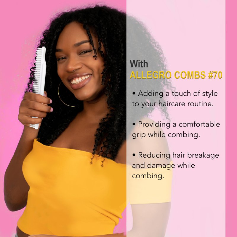 Allegro Combs #70 is a quality, 3-row comb designed to provide the ultimate detangling solution while enabling you to attain a salon-worthy look right at home. Proudly made in the USA. The comb's unique 3-row design makes it perfect for detangling and product application. Its wide-tooth design guarantees manageable, tangle-free hair, and its rounded teeth gently caress your scalp, minimizing hair breakage or damage. Additionally, the convex back design prevents product buildup, making cleaning straightforward. The Allegro Combs #70 is also resistant to staining and fading, retaining its vibrant color over time. Available in trendy, standout colors, this comb injects a dash of style into your haircare regimen. With its 7.80-inches length, it's travel-friendly and easily fits in your purse or bag. It's the perfect haircare gift for those who cherish their hair. More than a detangler, this comb is a versatile styling tool, perfect for parting, braiding, and crafting intricate hairstyles. It's ideal for thick and curly hair types. It's also designed to train your curls, making it a great choice for curly hair, barbershops, and all genders and ages. This hair comb is excellent for braiding, styling, and finishing, making it a versatile tool for all hair types. Its medium tension tooth comb is perfect for wet hair, while its wide tooth comb is ideal for wavy hair. Furthermore, the super wide tooth comb is perfect for fine hair. Its 3-row detangling comb feature facilitates easy hair detangling and styling, while its curling comb feature is perfect for curl training and styling. It's also great for shower use and is kid-friendly, thanks to its gentle touch on their delicate hair and scalp.