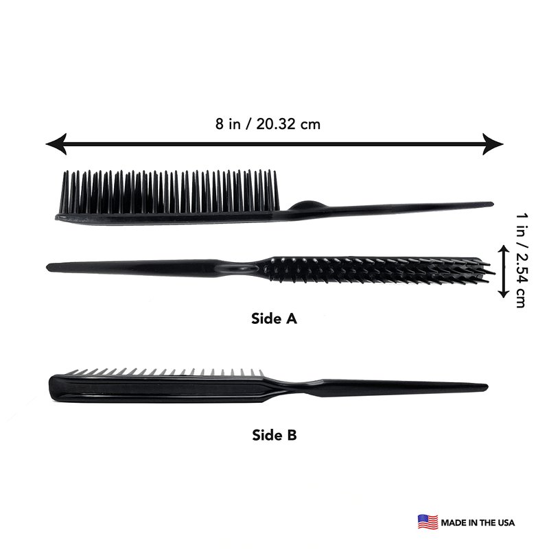 - THE THREE ROW COMB BRUSH WITH RATTAIL - 8 inches long for hair parting flexible body, curl defining brush smooth rounded tooth to penetrate the hair easily. Unbrush Detangling Brush. For applying hair products, since it doesn't absorbe liquids. Teasing combs for women blending brush. Combs for women Dimensions: 8 x 1 x 0.5 inches Made in The USA.