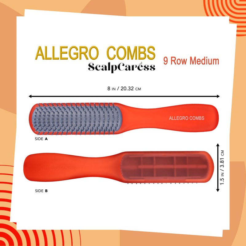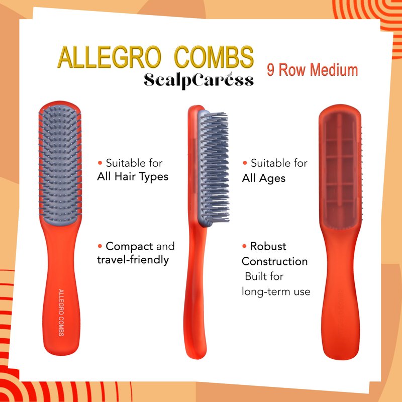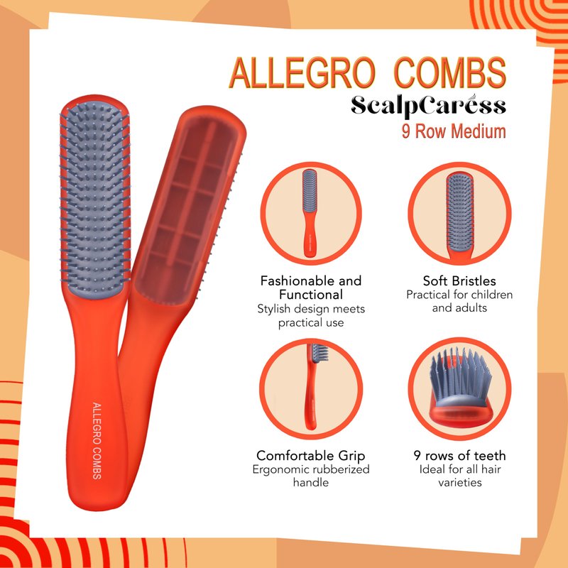 Discover the ultimate in hair care with the Allegro Combs ScalpCaress 9 row kids hair brush, a fusion of style and practicality crafted into an elegant and functional hair brush for curly hair. Womens hair brushes design for everyone, this tool caters to all hair types and styling needs. ideal size for womens hair brush both home use and travel brush. Built to last, the Allegro Combs ScalpCaress girls hair brush delivers durability and ease of maintenance. Travel brushes for hair with robust construction ensures it remains a steadfast part of your grooming collection for years. Soft bristle hair brush, Its versatility shines, effortlessly handling any hair type, from short hair, thin hair, and frizzy hair to long hair, wet hair, and dry hair. It excels in smoothing, detangling hair, and providing a soothing scalp massage, transforming your grooming routine into a great experience. The smoothing hair brush's ergonomic design delivers a maximum comfort during use. Say goodbye to pulling and snagging – the Allegro Coms ScalpCaress hairbrush for thick hair is engineered to glide through your hair with ease. Its smooth, rubberized handle provides enhanced control and comfort, making it suitable for users of all ages, from children to adults. Beyond its functional prowess, the Allegro Combs ScalpCaress 9 row untangle hair brush is a vibrant addition to your styling toolkit. This hair brush men is available in various trendy colors, it brings a lively touch to your daily hair care routine. Its chic design also makes it a thoughtful gift for children and friends, fitting for any special occasion. This detangler hair brush is an all-rounder, whether you need a detangler for curly hair, a soft bristle brush for sensitive scalps, or a reliable option for quick styling. It's perfectly suited as a women's hair brush, a gentle toddler brush, or a robust men's brush. Its compact design delivers it fits seamlessly into any bag or pocket, making it an excellent travel companion.