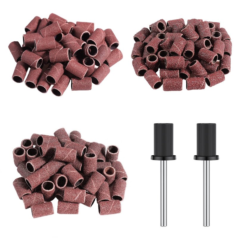 - 💅Nail Sanding Bands Set - This set includes 150pcs of brown sanding bands, with 50pcs #80 (coarse grit), 50pcs #120 (medium grit), and 50pcs #180 (fine grit). There are also 2pcs 3/32 inch black replacement nail drill bits sanding band mandrels, making it perfect for both manicures and pedicures.
