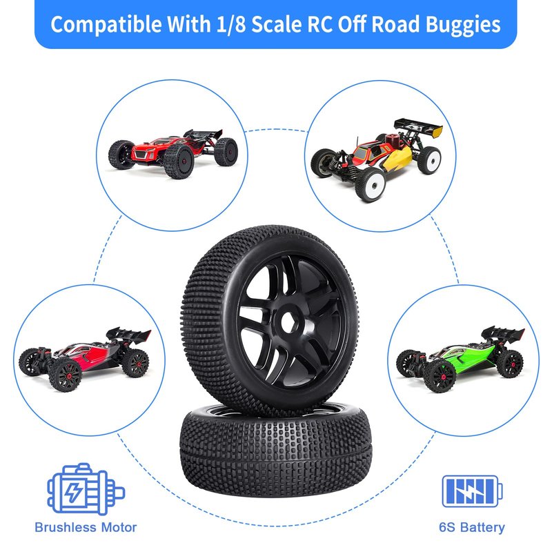 AllinRC PreGlued 1/8 RC Buggy Tires and Wheels 17mm Hex Hubs Foam Inserts for Arrma Typhon Redcat Team Losi VRX HPI Kyosho HSP Hobao Off Road, Set of 4