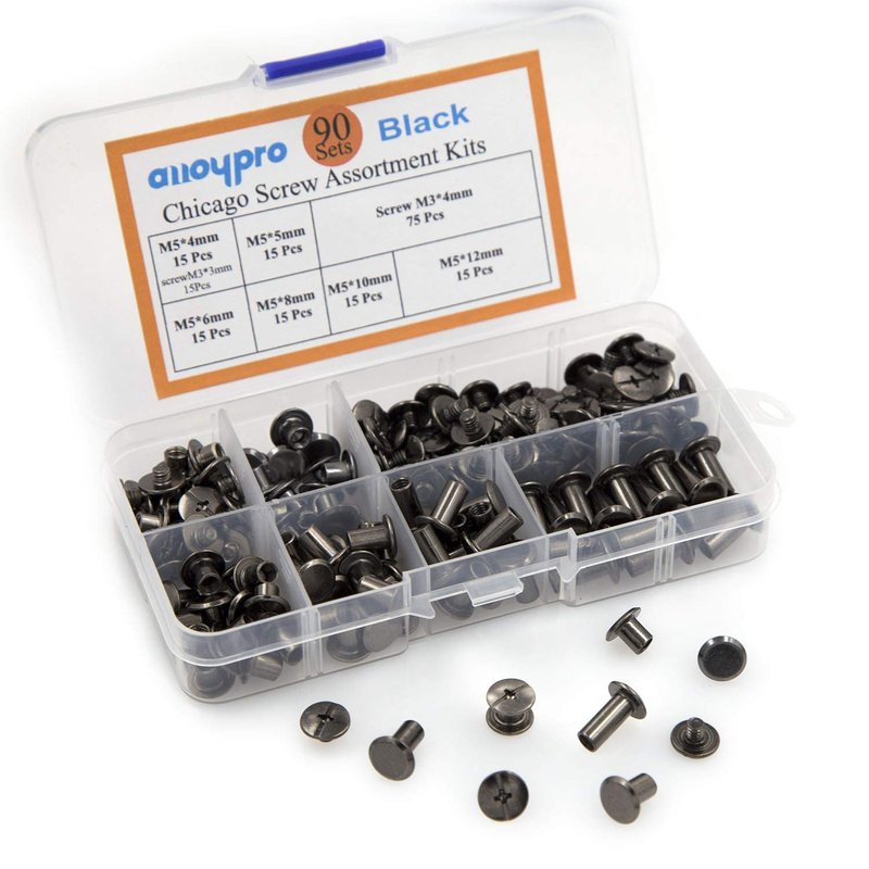 - 90 sets of 6 sizes:The chicago rivets set kit include 6 sizes,The chicago rivets set kit include 6 sizes(M5*4mm,M5*5mm,M5*6mm,M5*8mm,M5*10mm,M5*12mm). 15 sets for each size, the diameter of these screw rivtes are all 5mm(3/16 inch). 6 kind of post length are 4mm(1/6 inch),5mm(3/16 inch),6mm(1/4 inch),8mm(5/16 inch),10mm(3/8 inch),12mm(1/2 inch).Various lengths are available to meet your different needs.