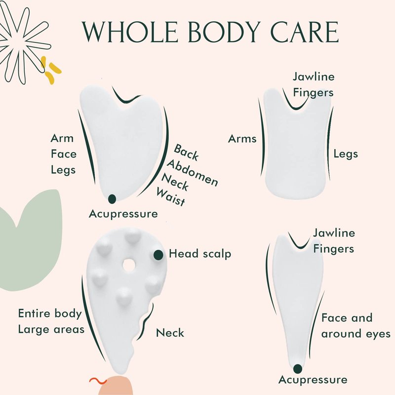 - FULL-BODY MASSAGE- 4Pcs Gua sha massage tool in different shapes can be used in different areas of our whole body. Scraping massage also eases pain from plantar fasciitis muscle knots, helps to diminish stress, fatigue, exhaustion, better to relax whole body.