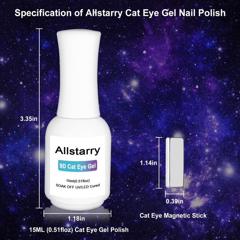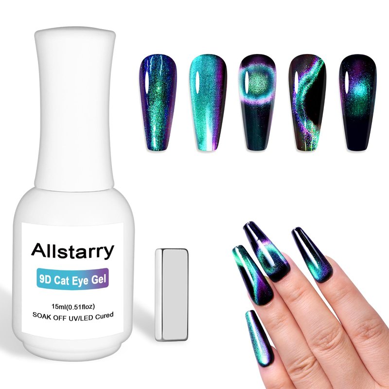 - Cat Eye Gel Nail Polish: Allstarry chameleon cateye gel polish equipped with a magnet wand that attracts particles easily from magnetic gel nail polish to create stunning galaxy sparkle cat eye nail art. Allowing you to experience and achieve salon-quality nail art effects at home.