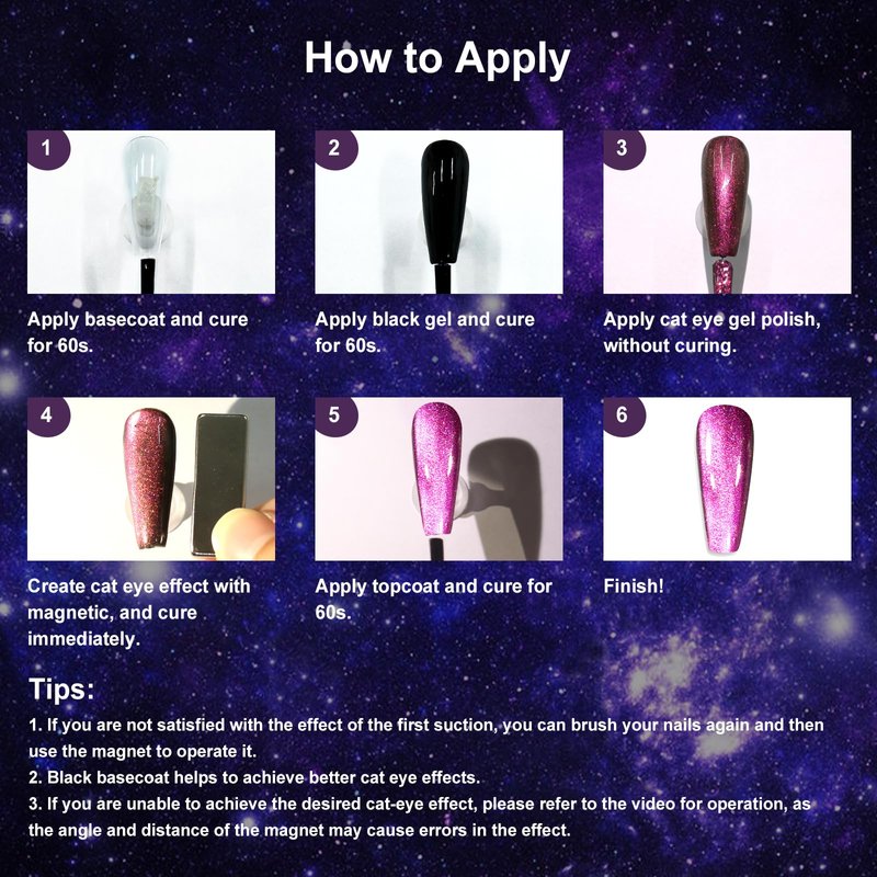 - Easy Apply and Long-lasting: Polish the nail surface, apply a basecoat and cure, then apply chameleon cat eye gel(do not cure), hold the cat eye magnet pen to stay close to the surface of nail for 10-15 seconds according to the cat eye effect you want but remember not to touch the nail surface; then immediately cure it with UV or LED light for 60 seconds. After that, apply top coat to make the nail art more stable.