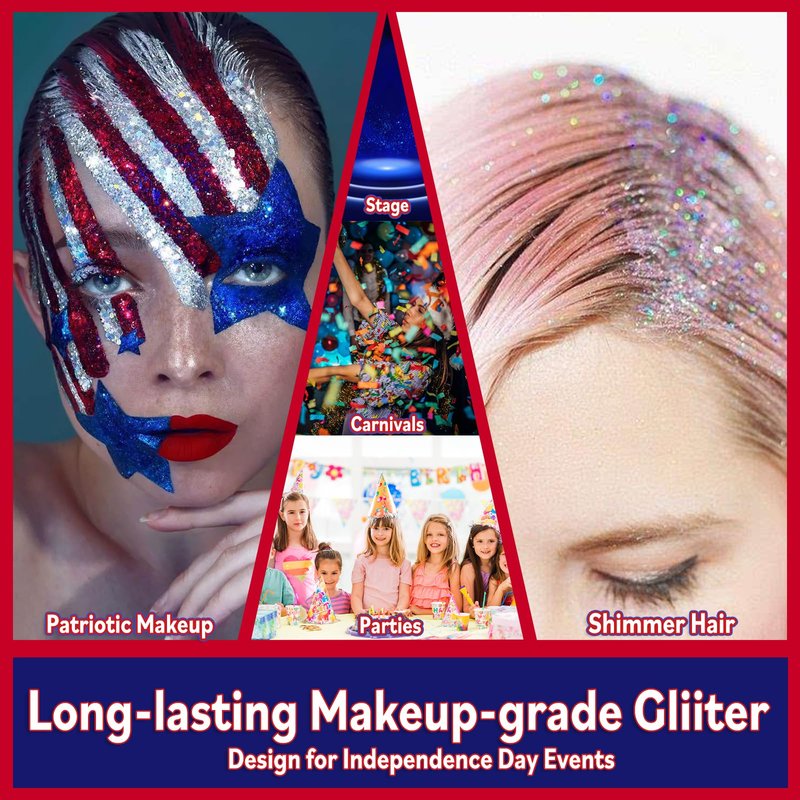 - 【Use Widely & Fully】Colors inspired from American flag, the red glitter, blue glitter,silver glitter and holographic silver star glitter are gorgeous to meet patriotic events. You can use the nail glitter crafting star flag patterns, spelling letters, making strips and 4th of July decorations over dip manicure, fake nails, and natural nails. And it can be used as patriotic face makeup glitter, body glitter, and hair glitter.
