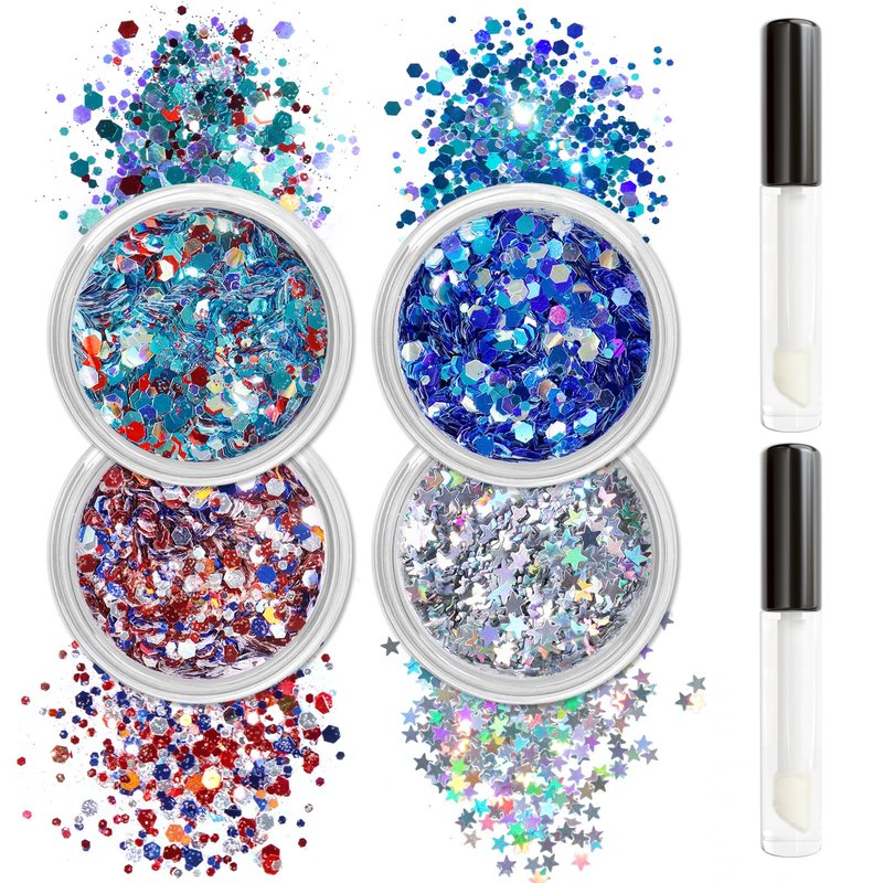 Allstarry Chunky Body Glitter 4 Colors Cosmetic Patriotic Face Glitter Veterans Day Eye Flakes Independence Day Hair Sequins Sparkle 4th of July Accessories for Women Face Paint Makeup Nails Art