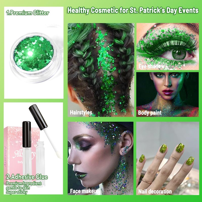 Why Choose Allstarry? ♥ Offer you quality products with a range of accessories at a reasonable price. ♥Our priority is to make customers satisfied whether with our products or our service. Specifications: Material: PET Package Included: 1.Four jars of body glitter Weight: 1.5g per jar 2.Two tubes of glue Capacity: 5ml per tube Glitter colors included: Hexagon holographic glitter Green Shamrock glitter Green glitter Laser heart glitter Applications: 1.This glitter is perfect for women as mermaid costume accessories, alien costume accessories, fairy accessories, rave accessories, and festival accessories, also great body cosmetic glitter for space cowgirl outfit 2.Apply them on the face, eyeshadow for glitter face painting, or neck, collarbone, chest, arms, and hands. 3.Apply them on the hair, the end of the hair, or mixing with braids, 4.Apply them on the nails, or stick them on costumes, glasses, and headbands. Glitter for makeup: 1.Apply the glitter glue on the skin with the applicator brush. 2. Dip the glitter from the jar with the brush. 3. Spread the glitter over the glue. 4. Clean the brush with water 5. restore the applicator brush into the glue jar. Cleaning Methods: 1. Clean with water directly. 2. Remove with makeup remover, then clean with water. Warm Tips: 1. Do not apply them over wounded skin. 2. Not the body glitter spray replacement, cannot refill into the spray bottle. Glitter for nail art: 1.Clean the surface of your nails. 2. Brush the base polish. 3.Then place the nail glitter onto your nails. 4. Apply the topcoat. If you apply them to other nail styles like extension nails, please follow their specific steps. Glitter for crafts: 1. Sire the craft glitter with some resin. 2. Pour them into a mold. 3. The resin get hard in 12 hours. 4. Demold
