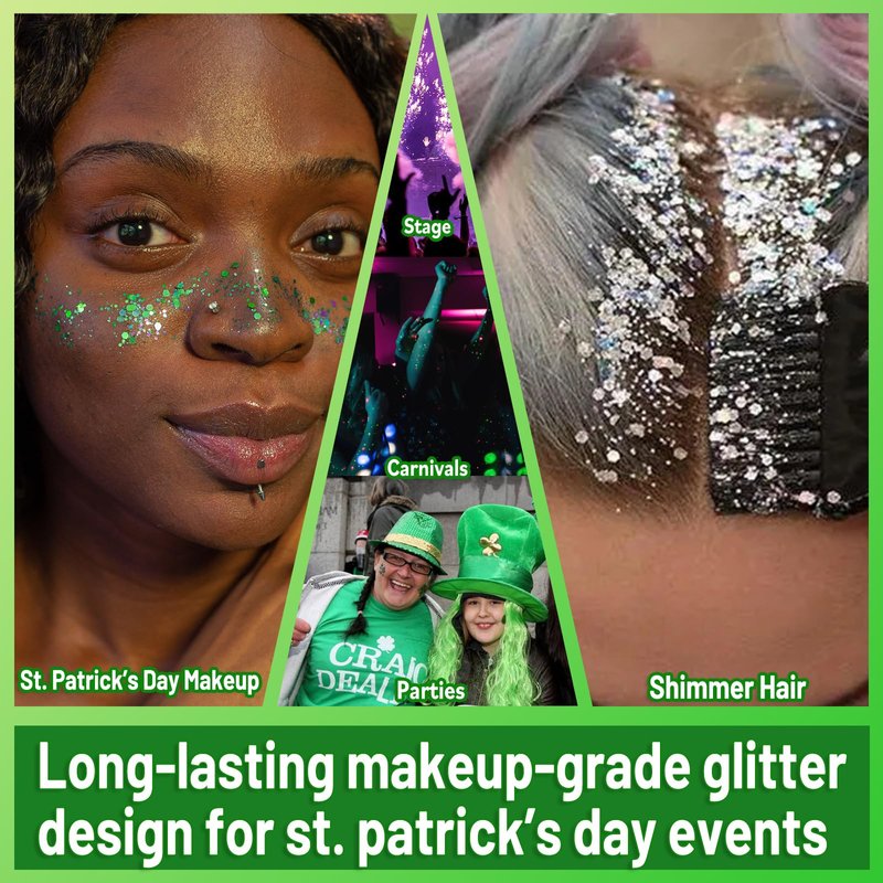 - Works Great: The holographic sequins mix different sizes of hexagons chunky holographic glitter stars, moons, laser green glitter and shamrock sequins, which makes it easy to evenly apply them on the skin and achieve pretty shimmer glitter makeup just using a little glitter face paint.