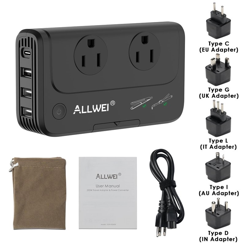 ALLWEI Travel Voltage Converter 220V to 110V Power International Travel Adapter for Hair Straightener/Curling Iron, Universal Power Plug Adapter UK, US, AU, EU, IT, India (Black)